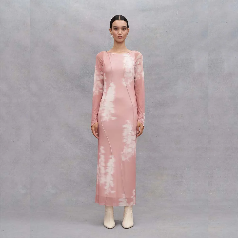 Long dress with long pointed sleeves and boat neckline, Eva model, in Oeko-Tex® certified stretch tulle lined at the body level with the Abstract print in Misty Rose and Tofu colors.