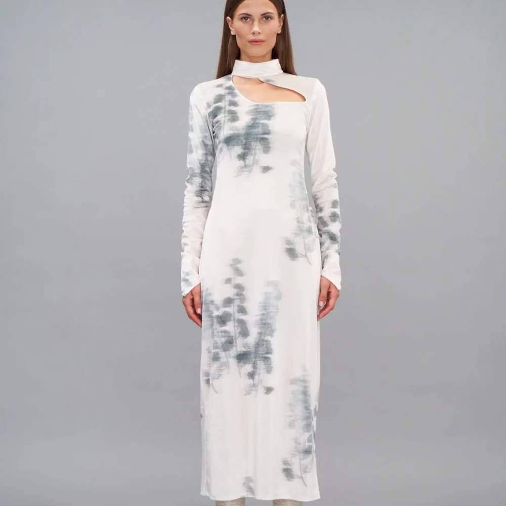 Its long, fitted cut is twisted by the overlocked seams at the front and back which resemble undulations, defining the silhouette. The organic Abstract print from the collection brings a dreamlike dimension to the room, with its scattered repetitions of blurred botanical prints, like hypnotic mirages.