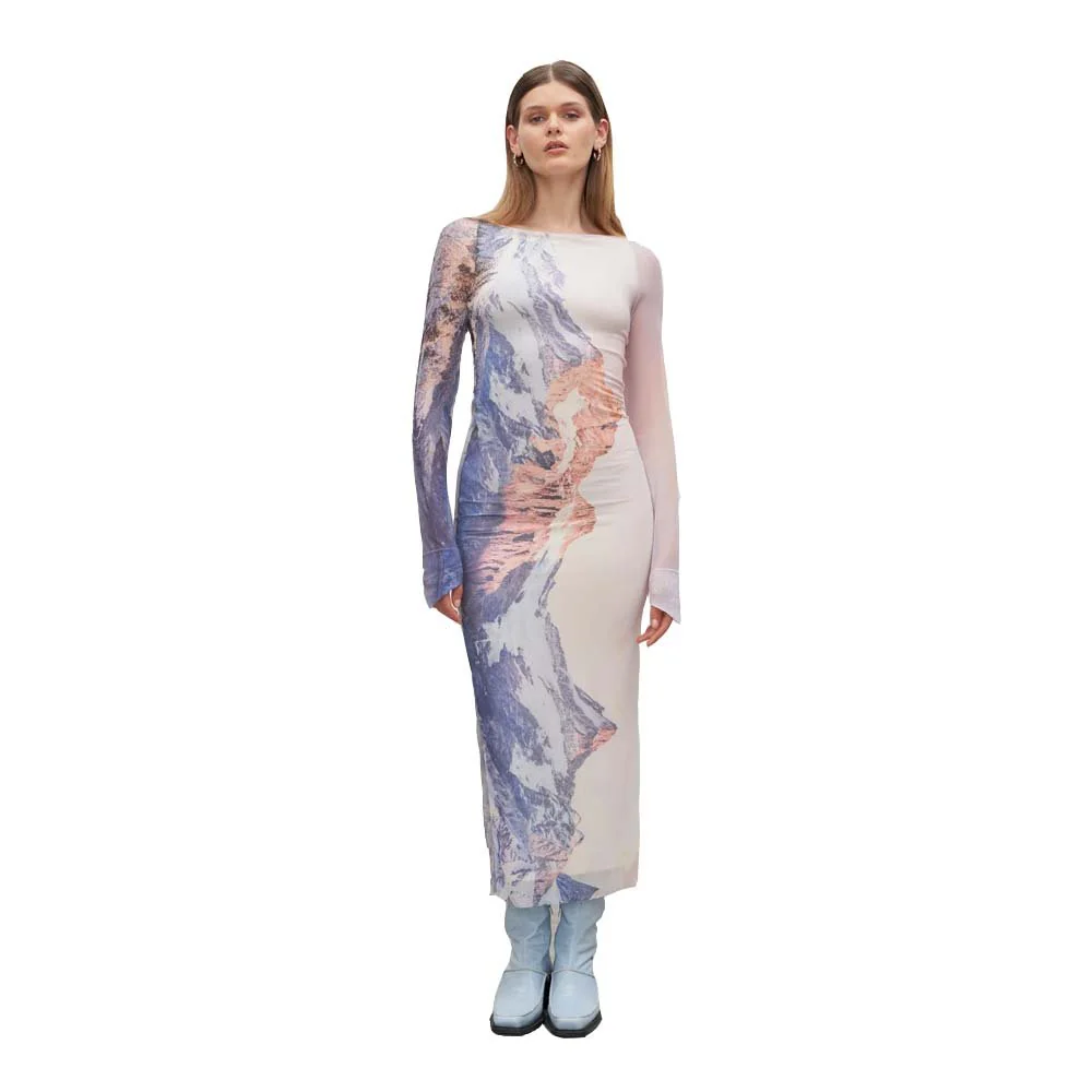 Long dress, fitted close to the body, with boat neckline and long pointed sleeves, Sartene model, in lined Oeko-Tex® stretch tulle (except on the sleeves) decorated with the Reborn print. Popular for the Corsica collection, the Sartene dress returns to the forefront, this time showcasing the Reborn print, emblem of the new collection. This print features a mountain landscape lulled by the warm light of the rising sun and reflected in a body of water. The call of nature comes to life through this poetic motif of introspective contemplation.