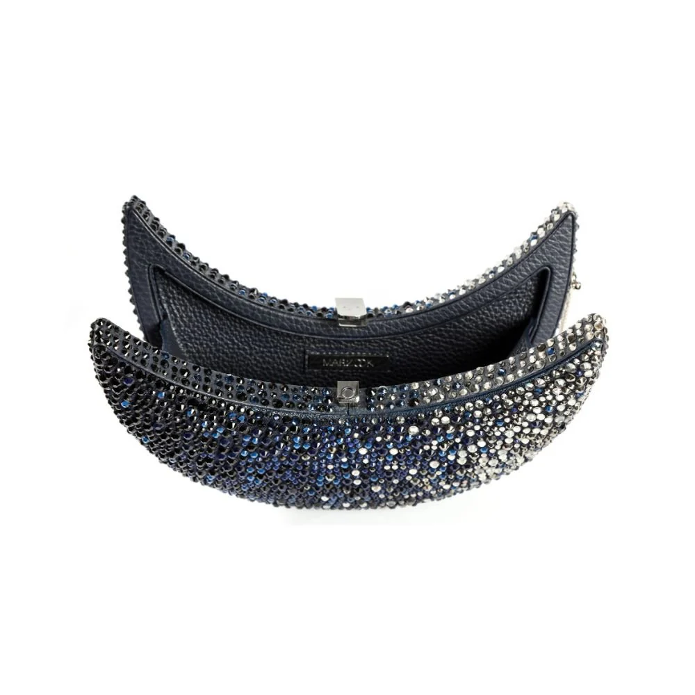 Perfect for festive occasions, this crescent shaped bag from Marzook is crafted out of fine leather and covered with dentelle and adorned with Swarovski crystals. The bag features a silver plated lock as well as a chain making it versatile and easy to wear.