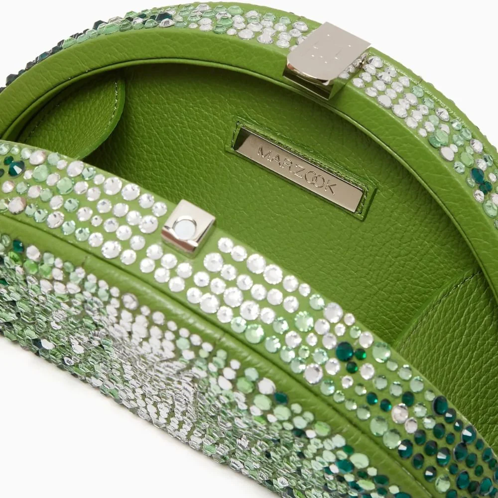 An iconic signature shape from Marzook, this piece is made of pebbled leather embellished with Swarovski crystals in an ombré hue. The silver plated lock adds a touch of luxury to this festive piece.