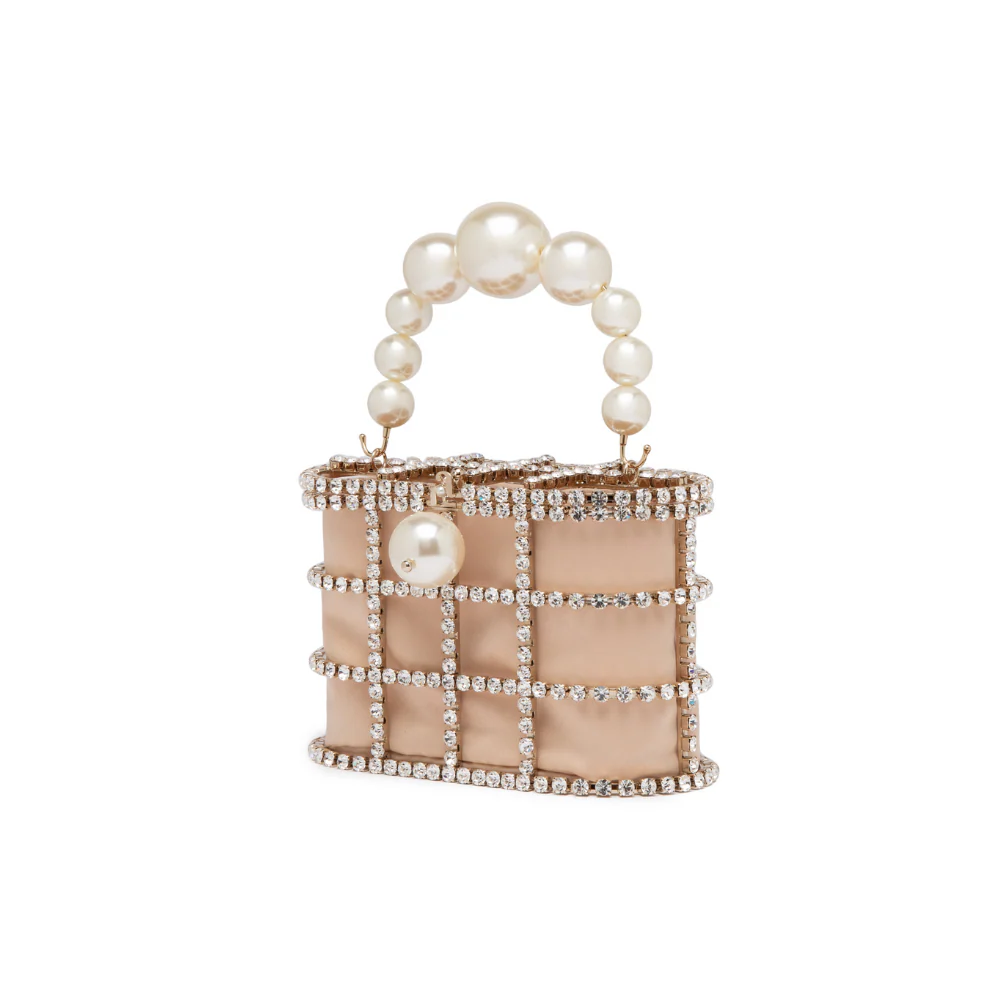 The "Holli" bag from Rosantica is crafted with crystals and faux pearls on a gold-tone brass frame. Undoubtedly Rosantica's most iconic bag, this version of the Holli features clear crystals and a removable neutral-colored fabric pouch. The signature extra-large faux pearl handle is now removable, allowing the Holli bag to be worn with other unique shoulder straps, allowing for both shoulder and hand carry.