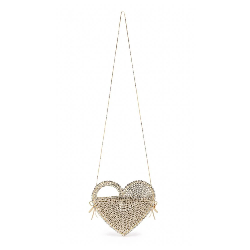 An explosion of brightness and the romantic heart-shaped design are the characteristic of the "Regina" bag . Designed in golden brass and clear crystals. The inside pouch is made of taffeta fabric with a zip closure. Wearable over the shoulder, thanks to a removable golden crossbody chain to make it more versatile. An ideal accessory to embellish all your looks.